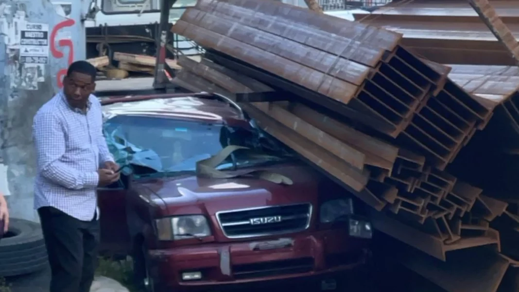 Conductor sale ileso tras caída de vigas de acero sobre su vehículo en la autopista Duarte