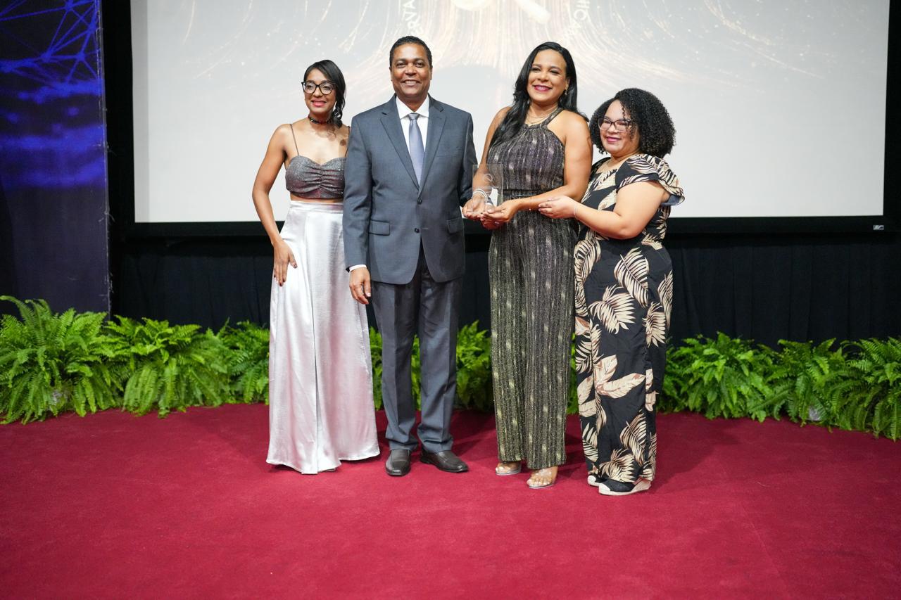 Colombia Alcántara subió al escenario acompañada de Wen Caminero, coordinadora y jefa de redacción del periódico Altanto.com.do, y de Roviana Sánchez, administradora del medio. Las tres celebraron juntas el reconocimiento como un logro colectivo que refleja el compromiso del equipo con el periodismo digital responsable.