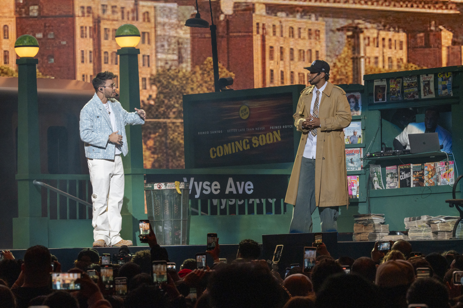 El «rey» y el «príncipe» de la bachata demostraron su sintonía personal y profesional al moverse por el escenario, decorado como una calle cualquiera de la ciudad donde ambos crecieron, con un vagón de metro, unos bancos, un kiosko con un DJ dentro y, de fondo, una vista al puente de Brooklyn.